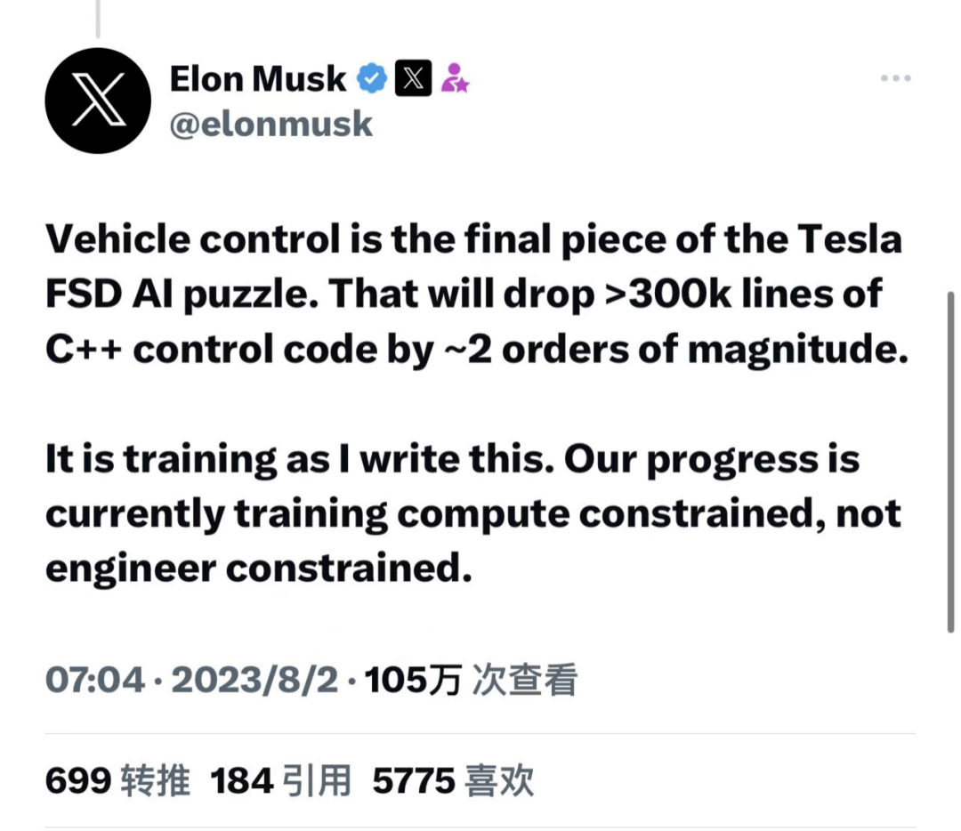 今年8月2日,马斯克在「X」平台上发布帖文,其中提到了特斯拉正在开发“车辆控制是特斯拉FSD人工智能的最后一块拼图,目前正在接受训练”,并透露AI将使原始FSD中的三十万行C++控制代码减少约两个数量级。