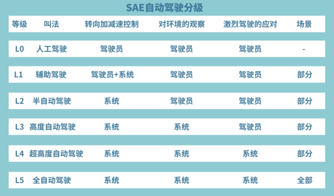 国际标准中,自动驾驶被分为L0到L5六个级别。L0到L2阶段被称为辅助驾驶,驾驶员把控方向盘,系统提供类似加减速、变换道的辅助。L3到L5被称为自动驾驶阶段,由系统逐渐接管车辆控制,适用范围不断扩大,驾驶员参与程度依次降低。