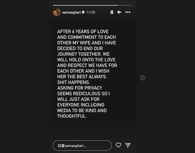 在男方这边的消息源哐哐哐一通爆料完,男主山姆也终于发声了,“经过六年的爱与对彼此的承诺,我和妻子决定一起结束我们的婚姻旅程。我们将保持对彼此的爱和尊重,我祝她永远一切顺利。糟糕的事情发生了,要求个人隐私似乎很荒谬,所以我只要求包括媒体在内的所有人都保持友善和体贴”。