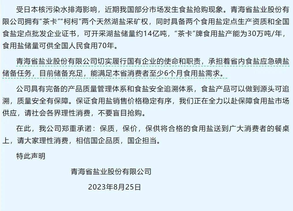 8月25日,青海省盐业股份有限公司发布声明称,该公司拥有“茶卡”“柯柯”两个天然湖盐采矿权,同时具备两个食用盐定点生产资质和全国食盐定点批发企业证书,可开采湖盐储量约14亿吨,“茶卡”牌食用盐产能为30万吨/年,食用盐储量可供全国人民食用70年。