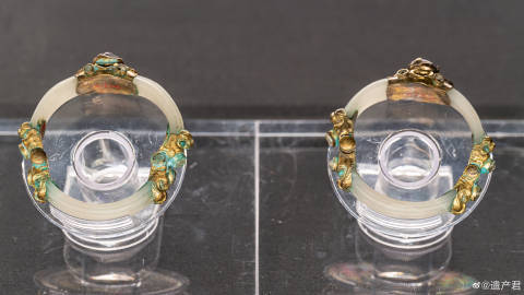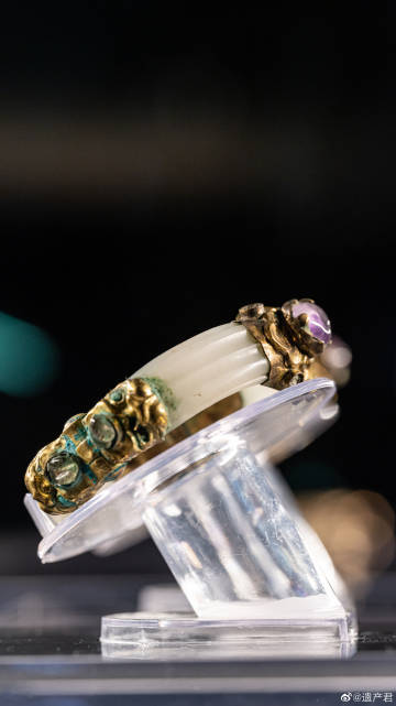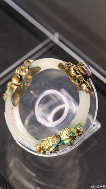 何家村窖藏出土,玉臂环由三段弧形白玉连接而成,每段玉的两端均包以金制兽首形合页,并以两枚金钉铆接。