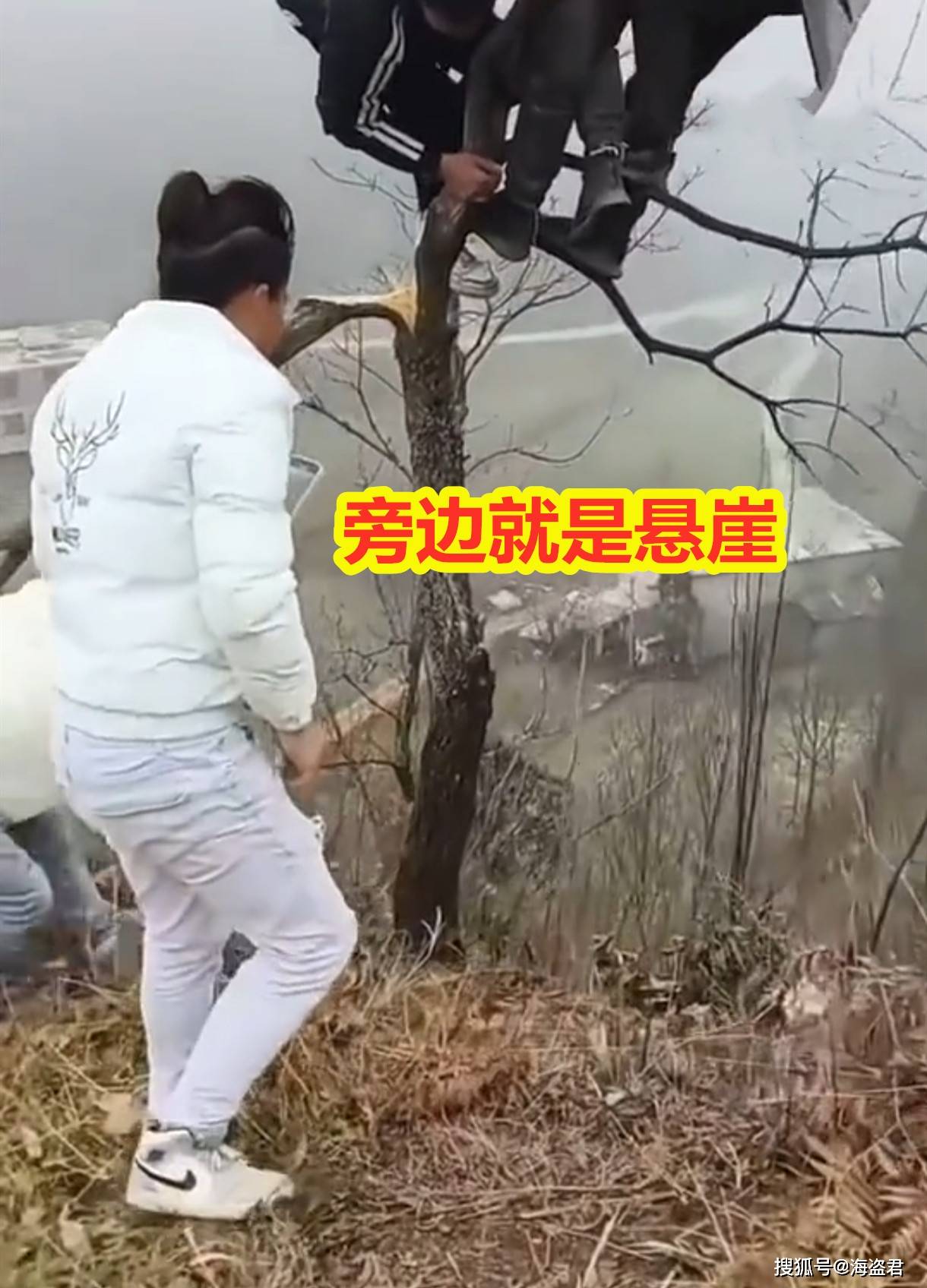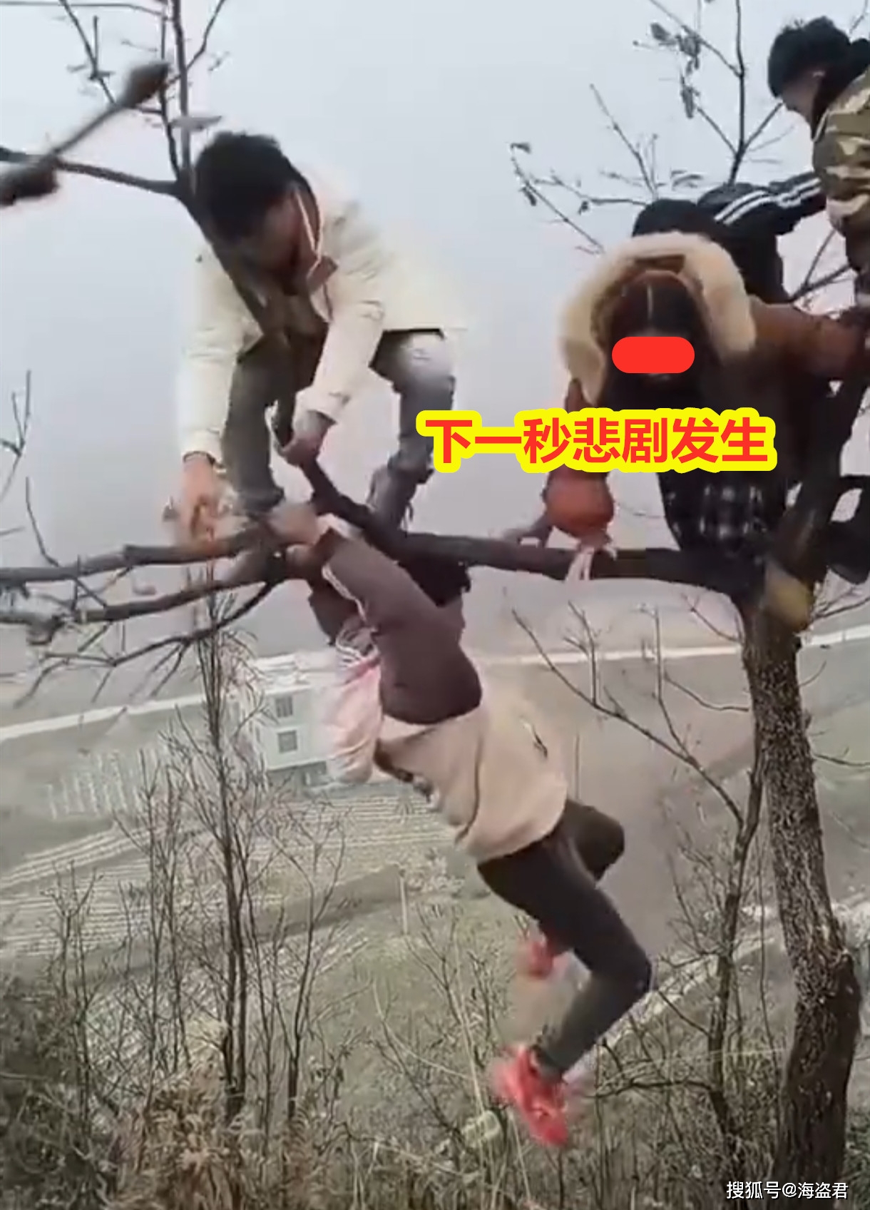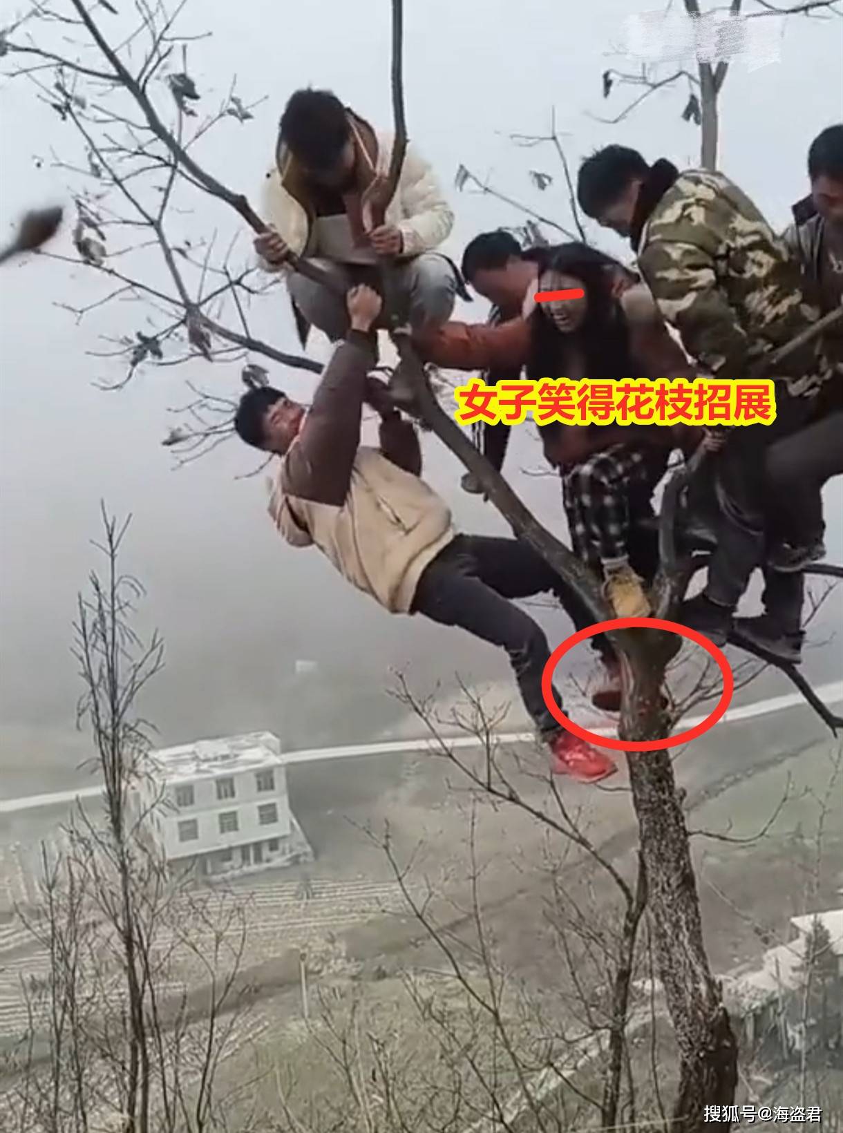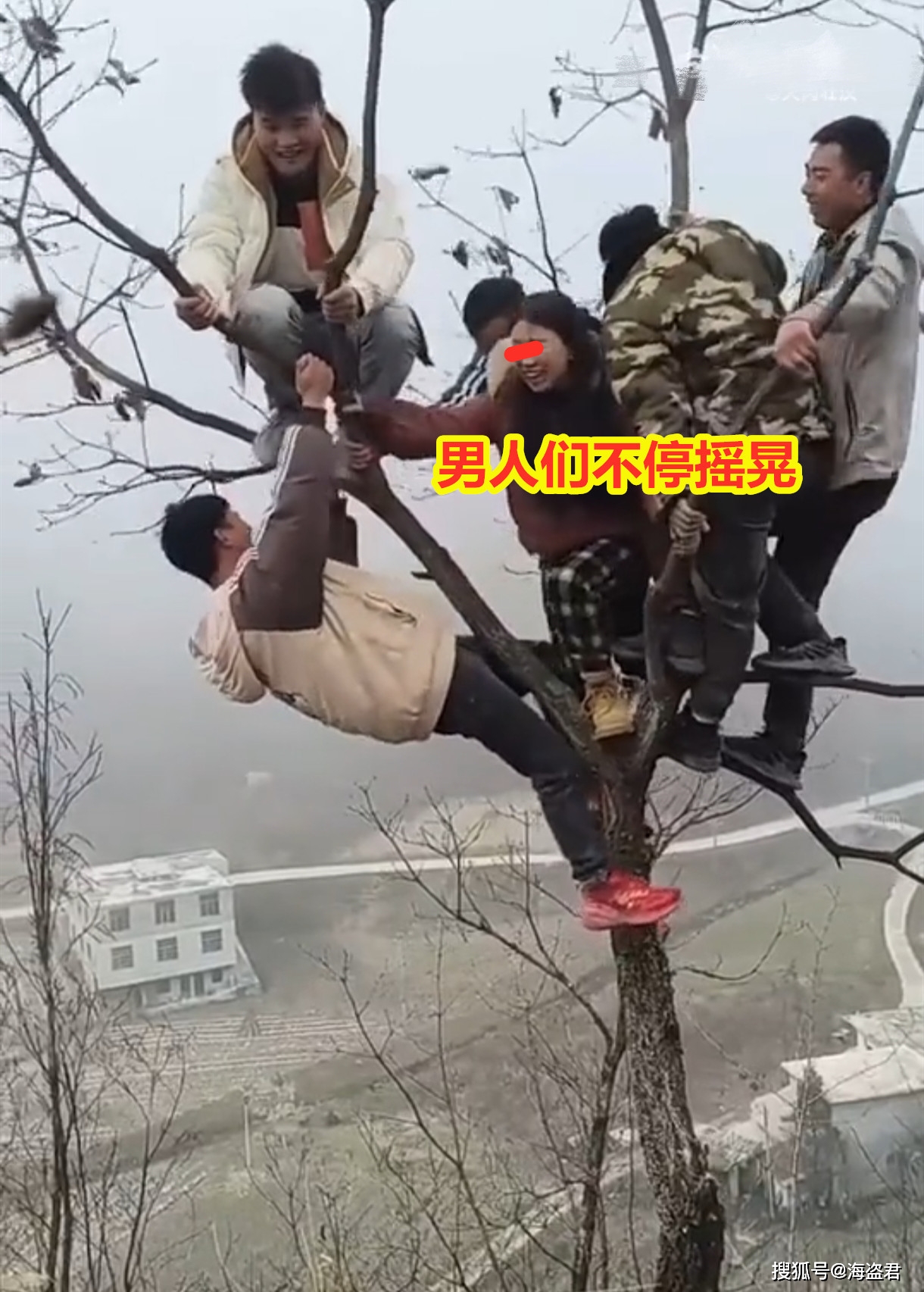 标题:女子和5男子树上玩耍,被逗得哈哈笑突然树枝断裂,旁边就是悬崖