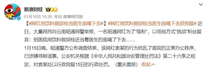 去年12月28日,有粉丝留言:挑战倒杯冰红茶去医院做尿检,当着医生面喝下去。