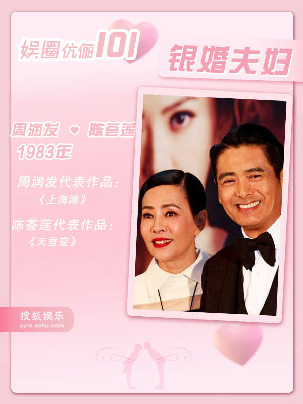 说完了娱乐圈的金婚夫妻,接下来就来盘点一下银婚夫妻。周润发和妻子陈荟莲,是让很多人都羡慕的神仙眷侣。他们俩结婚长达31年,还一直恩爱,可以说是模范夫妻了。周润发对她一见钟情,确定彼此都是想要携手一生的人后,两人在1987年领证结婚。因为周润发的工作特别繁忙,为了能好好照顾他,陈荟莲在结婚之后就成了他的秘书兼经纪人,以及生活助理。而周润发也从结婚之后,将所有的精力都投入到了事业与婚姻之中,再无花边绯闻传出。
