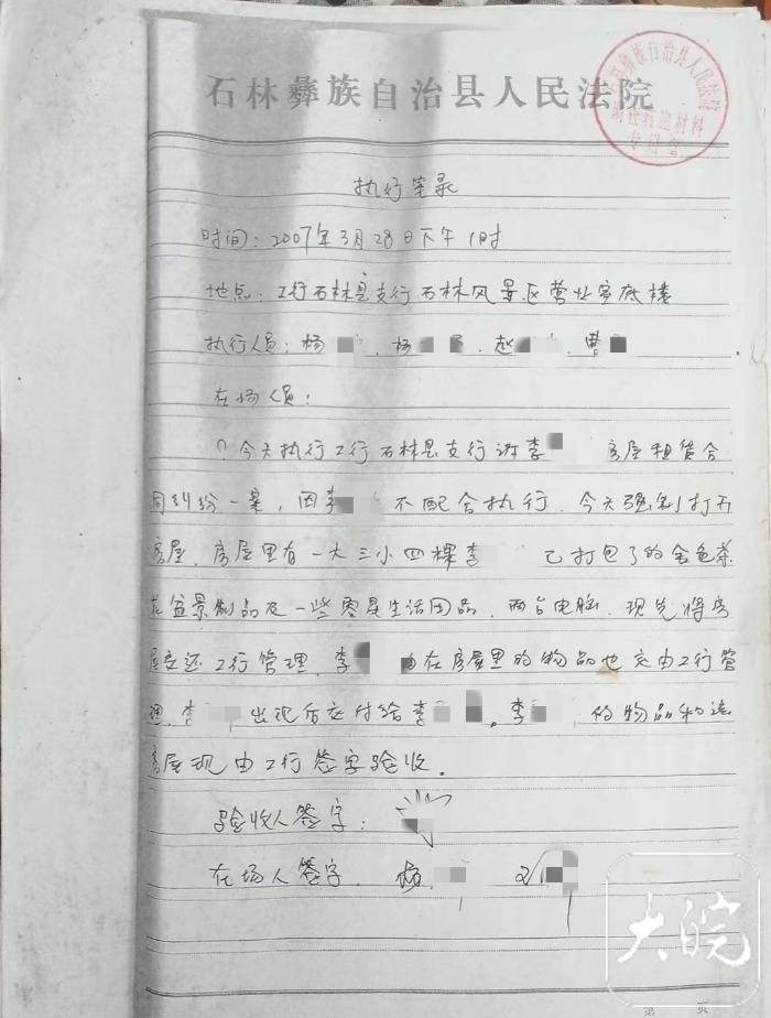 记者注意到,石林彝族自治县人民法院2007年3月28日的执行笔录显示,工行石林支行诉李女士房屋租赁合同纠纷一案,因李女士不配合执行,当天强制打开房屋,屋内有“一大三小”四棵已打包的金色茶花盆景制品以及一些生活用品,交由工行管理。文中还明确提到,李女士出现后会交付给她,且李女士的物品由工行签字验收,下面还附上了验收人和在场人的签名。
