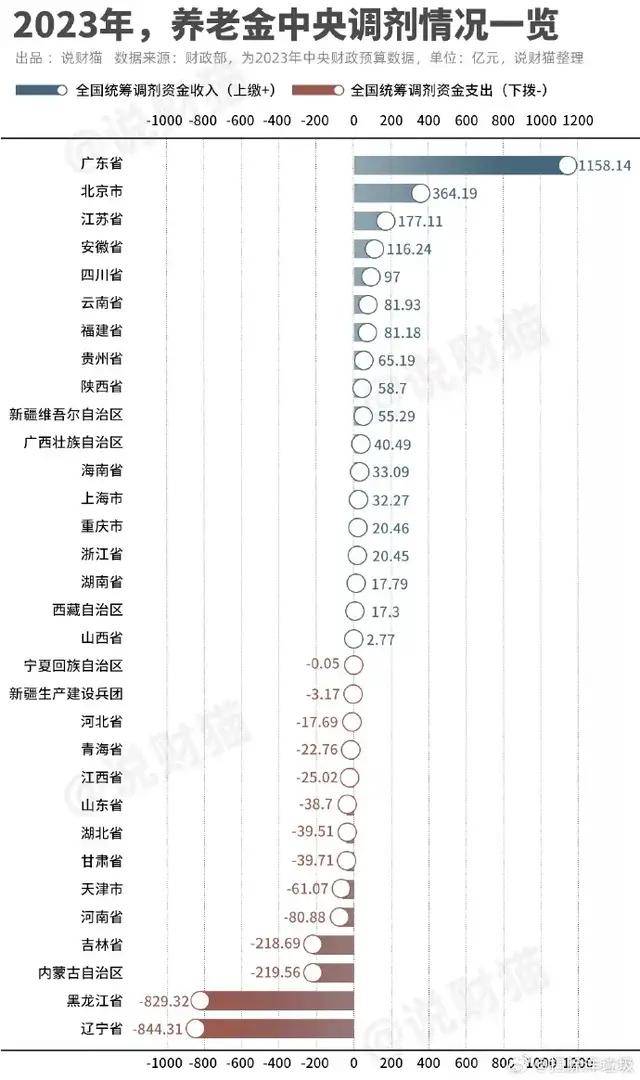 广东这一个省上缴1158亿,占了将近一半,位居全国第一。调剂下拨给缺口最大的一个辽宁加小半个黑龙江,网上还出现了“东北人靠广东人养老”的说法。