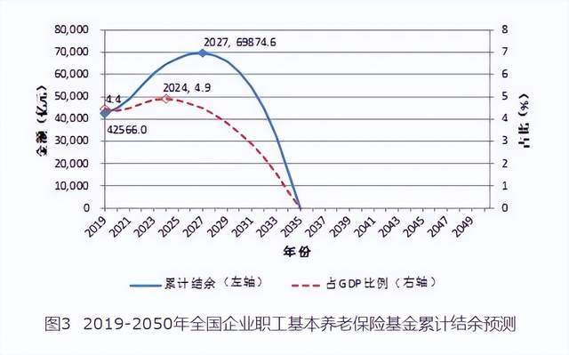 2019年,中国社科院发布过一份《中国养老金精算报告2019-2050》,根据一系列假设框架进行预测,结果表明,2019年全国城镇企业职工基本养老保险基金累计结余为4.26万亿元,此后将持续增长,到2027年达到峰值6.99万亿元,然后开始迅速下降,到2035年耗尽累计结余。