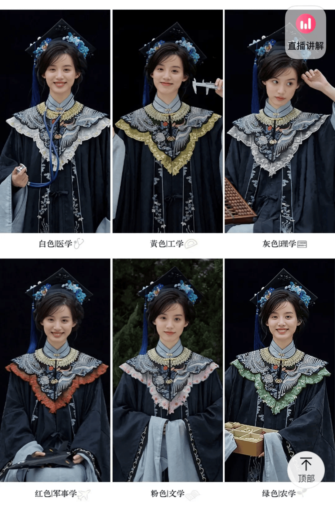 因为云肩的发展与改良,使得军、工、医、文、理、农等学科门类,总能找到靓丽又适配的搭法。