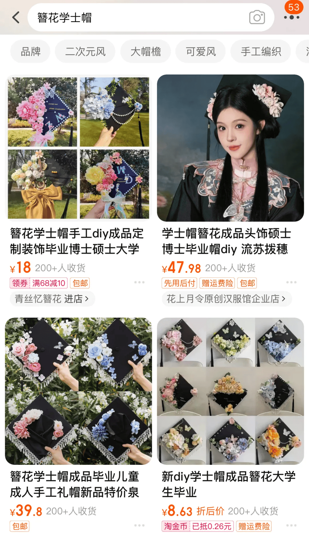 此外,还有小年轻对学士帽下手,添置簪花学士帽。