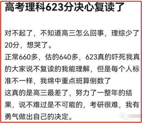 今年高考出分后,有位理科623分的考生发文决心复读,消息冲上热榜,这位考生表示这是他高中三年最差的成绩,心有不甘的他一心只想着复读,目标660分。