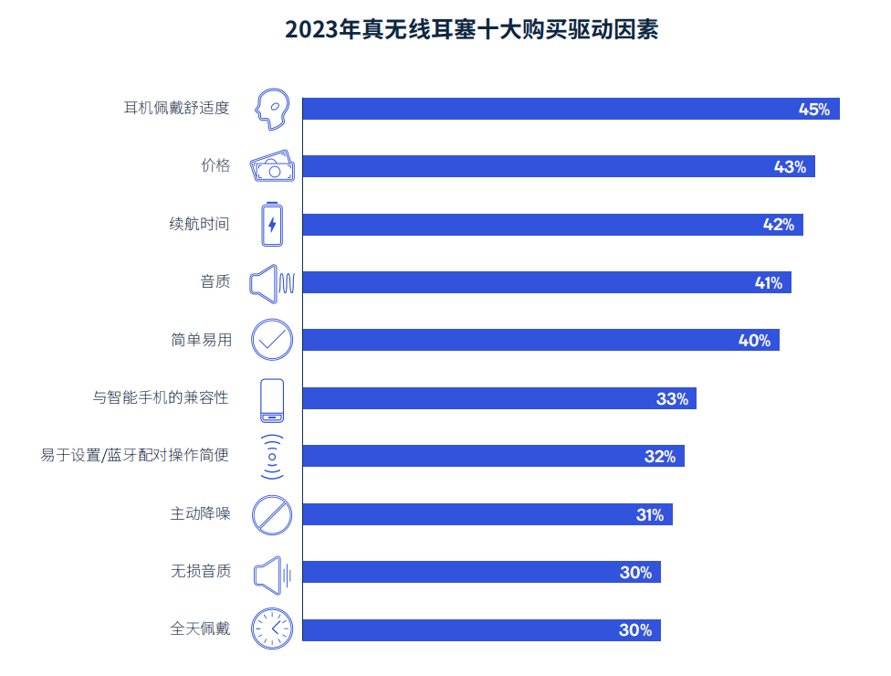 至于价格这个敏感因素,在高通的调研中,近几年基本保持在前三,还曾在2022年短暂地来到过第一的位置。而在最新的2023年报告中,价格在30美元以下耳机的用户最在意的仍是价格,只是整体而言,随着大家在电子产品上消费的增加,价格的重要性相应地降低了。