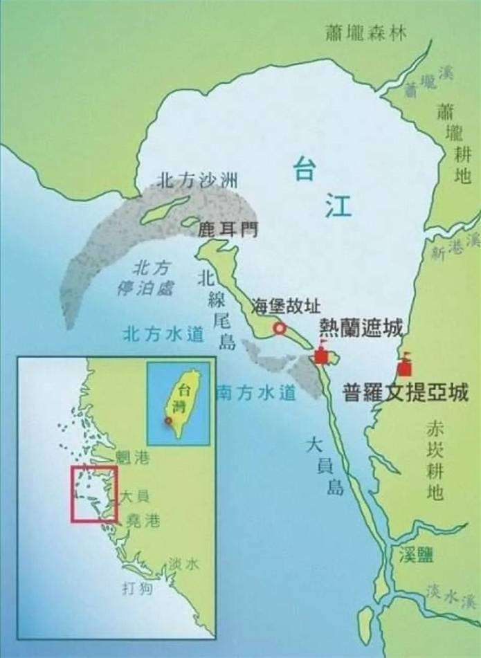 台南地区是台湾最平坦的地区,这里也是从大陆到台湾的最佳登陆点。此地的海陆形势非常奇妙:整个港口分为内港和外港,中间有大员岛、北线尾岛等隔开。要登陆的船只要进入内港只有两条航路可以选择,一条是南航道,这里口宽水深,船易驶入;另外一条是北航道,这里水浅道窄,只能通行小舟,大船必须在涨潮时才能通过。