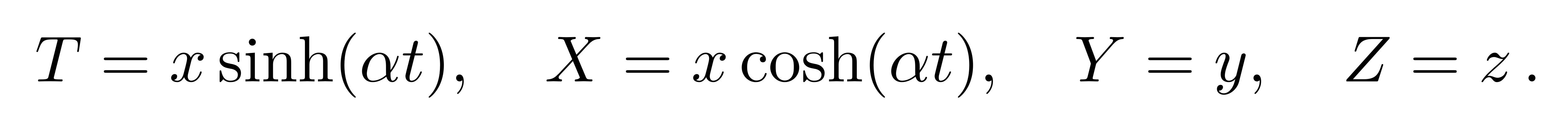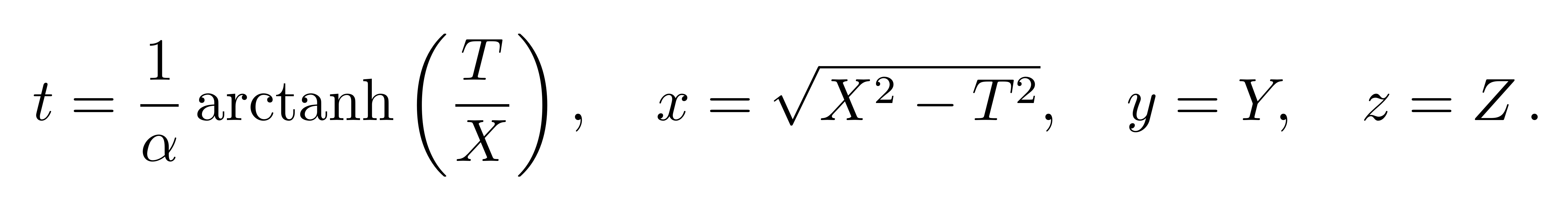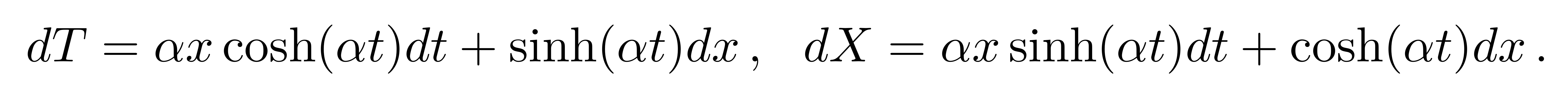 我们用(T,X,Y,Z)表示一个惯性坐标系,用(t, x , y, z)表示匀加速坐标系。存在一个如下的坐标变换联系两个坐标系