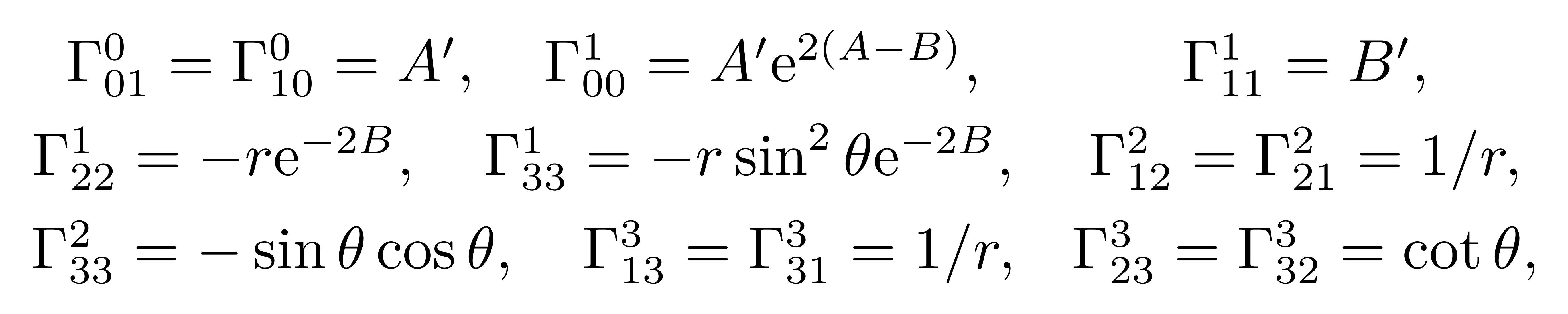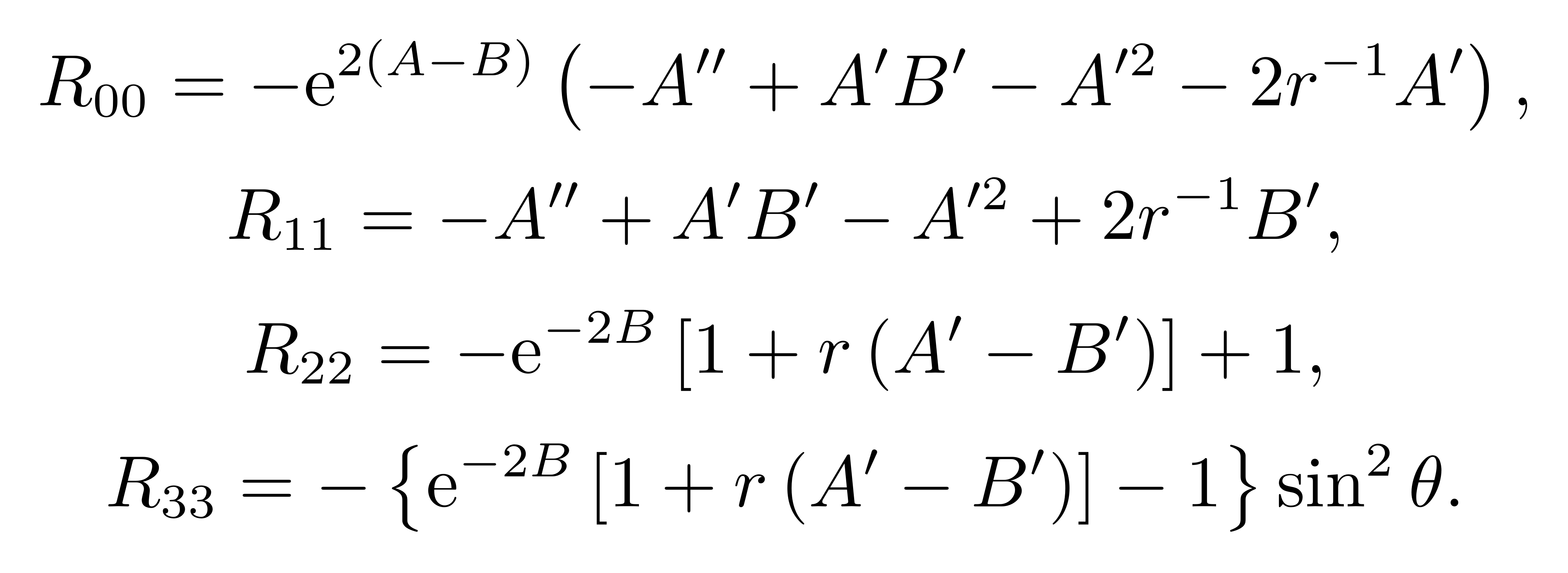 其中A’,B'表示对r求导。再把克氏符代入到黎曼曲率张量中,缩并后得到非平凡的里奇张量为