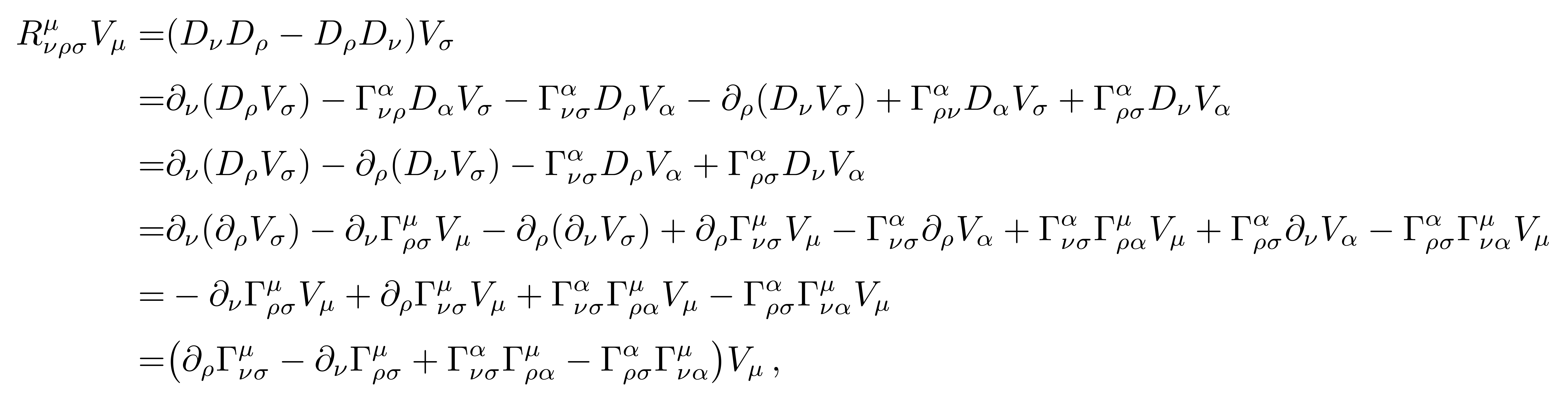 由于矢量V 是任意的,因此黎曼曲率张量可以表示为克氏符沿两个方向的导数之差加上克氏符的乘积之差