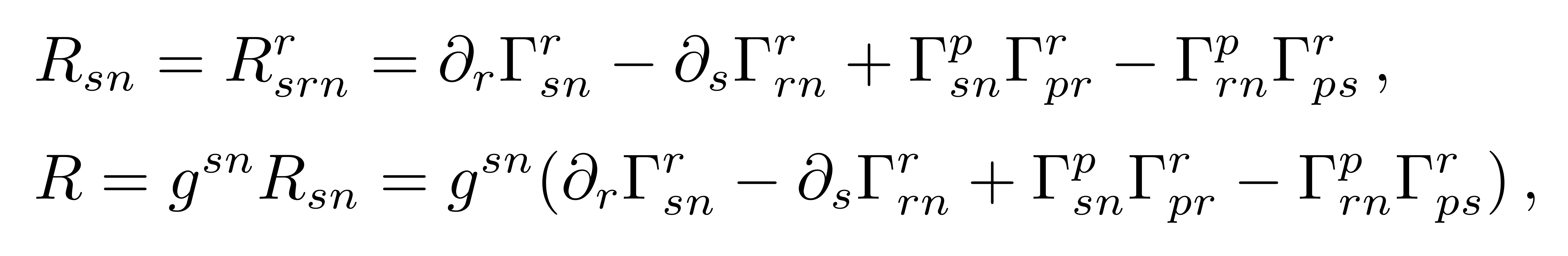 G是一个二阶对称张量,带下指标s和n的R也是一个对称张量,称之为里奇张量(Ricci tensor),最后一个标量R称之为里奇标量。