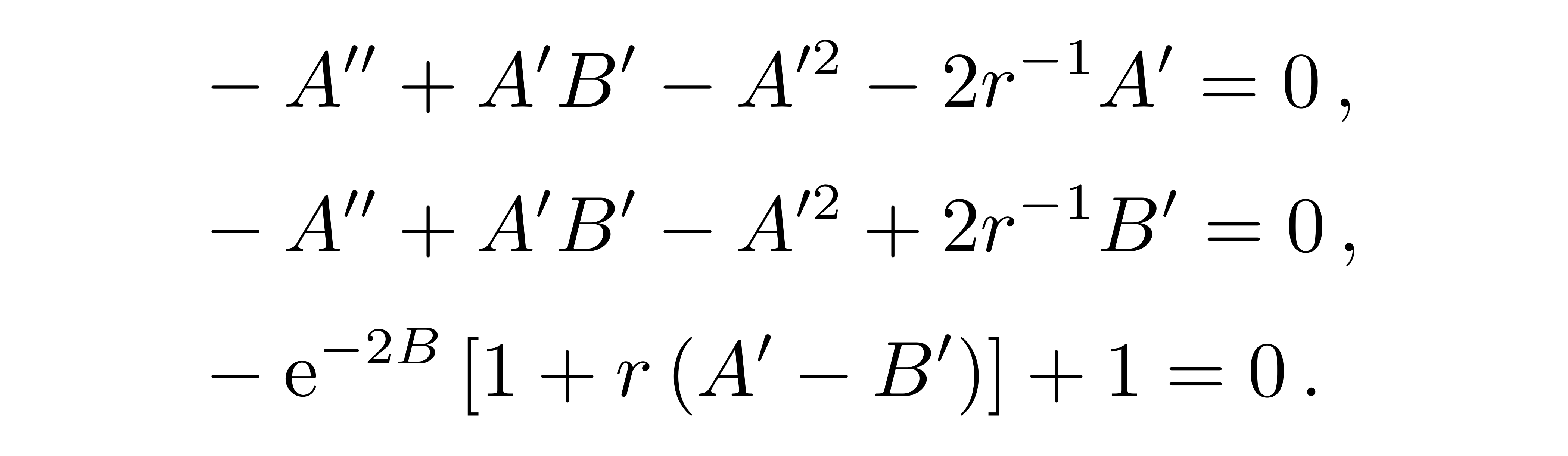 张朝阳强调,学习广义相对论应该亲自下场计算一遍上述的克氏符和里奇张量,才能找到一些学习广义相对论的感觉。由里奇平坦条件可得到如下的3 个关于待求一元函数A(r) 和B(r)的微分方程