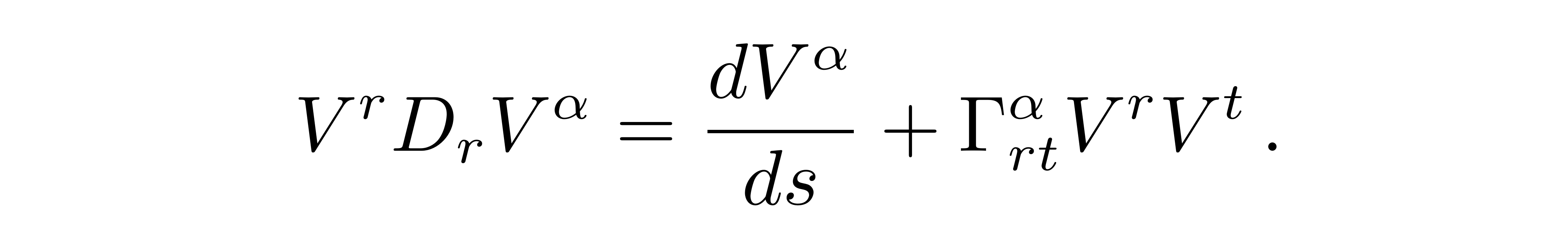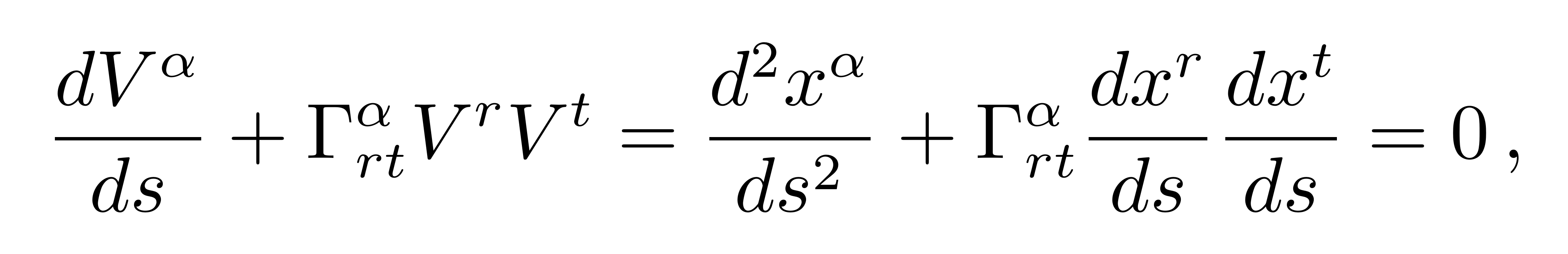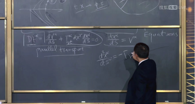 因此在弯曲时空中,将普通导数推广成了上述的协变导数。我们现在认为矢量F是曲线的切矢,后面记为V,它沿着自己的积分曲线平移,其中线长参数为s,则方程可以重写为