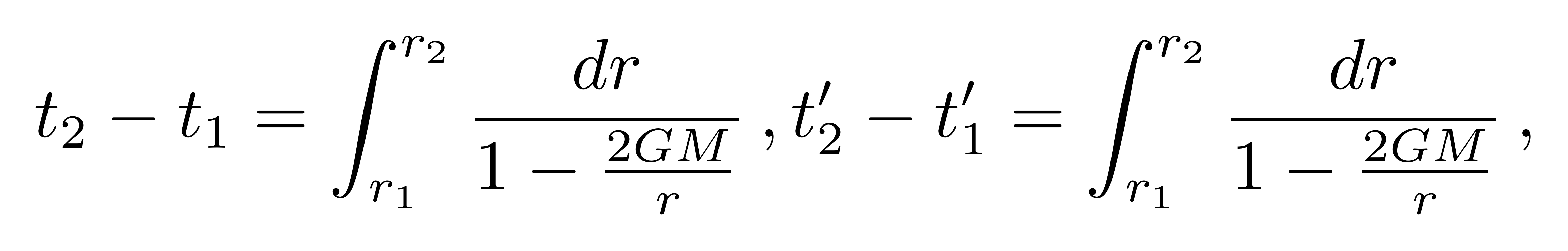 我们主要计算引力带来的效果。考虑一个地面附近的观测者以及一个距离地面很远GPS卫星上的观测者,假设他们都是静止的,也就是只考虑r与时间t两个坐标的二维情况,可以证明两个观者处的坐标时是相同的。假设地面观者坐标r1,在t1时刻开始计时并向太空观者发送信号,太空观者坐标r2,接收到信号的时刻为t2;地面观者t1'时刻结束计时,发送信号,太空观者t2'时刻接收到信号同样结束计时,即有