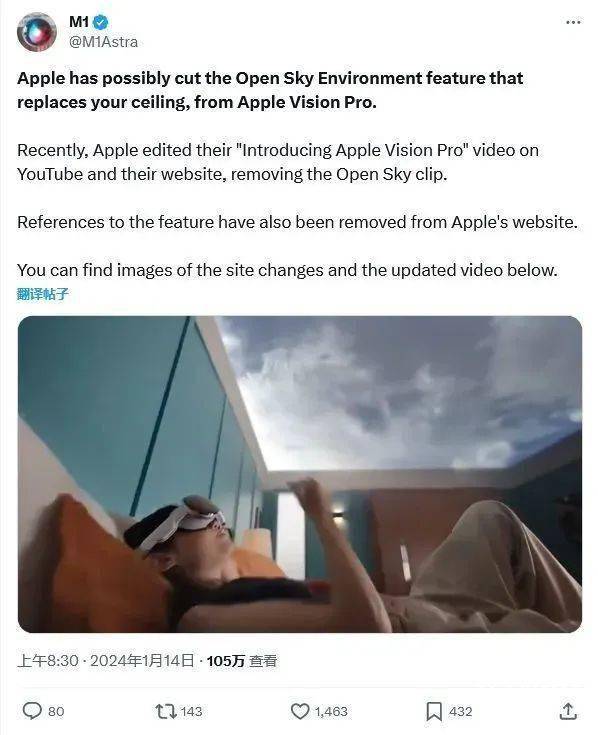 除此之外,还有细心网友发现,目前苹果官方网站上关于Vision Pro的介绍,删除了一项名为 “天空替换” 的功能,这项功能可以将房间里的天花板在虚拟世界里渲染成各种美丽的天空。目前尚不清楚苹果移除该功能的原因,不过有外媒猜测,由于该功能从未达到预期效果,因此苹果公司选择将其取消。