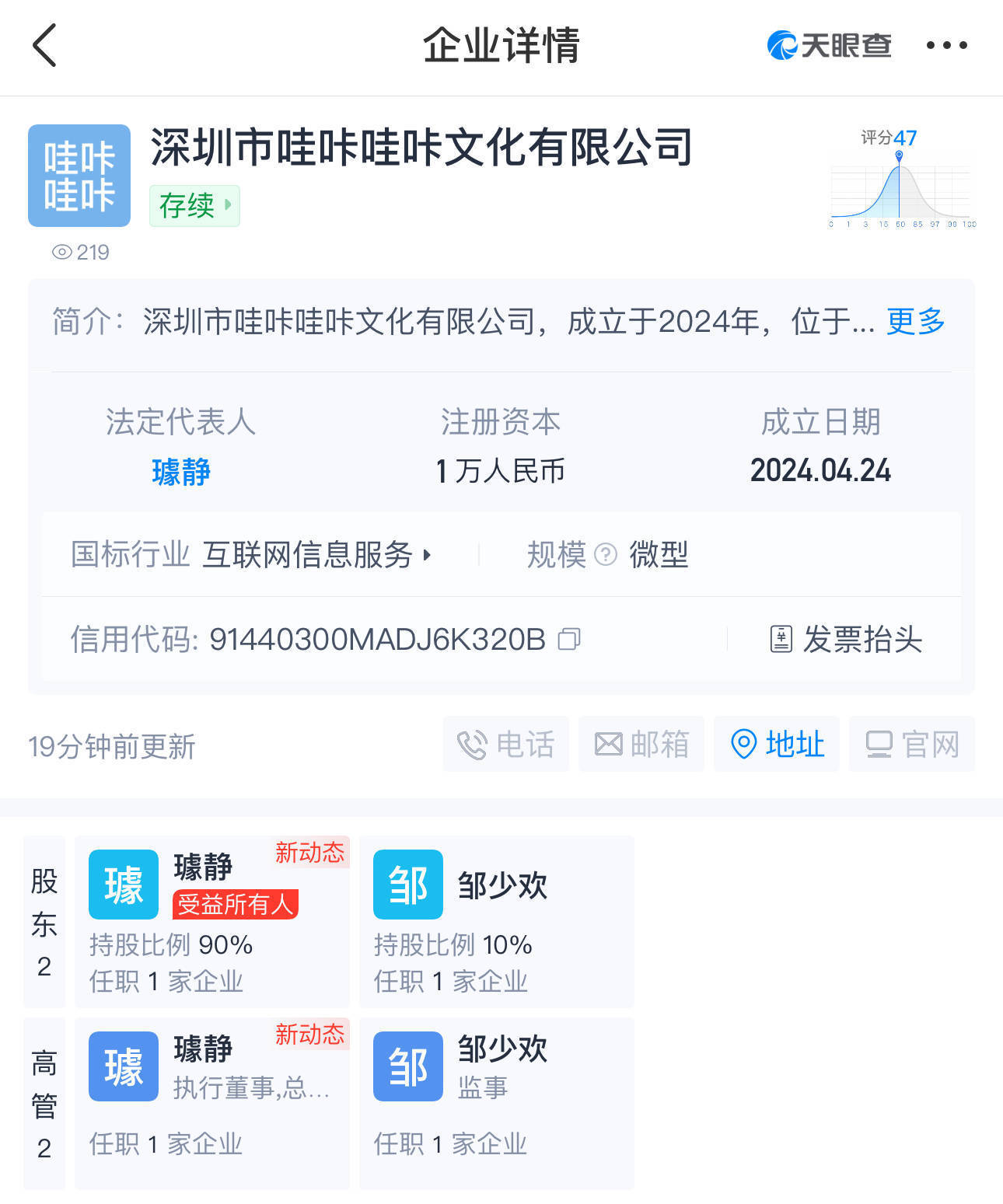 5月9日,天眼查APP信息显示,深圳市哇咔哇咔文化有限公司于今年4月24日成立,这是一家以从事互联网和相关服务为主的企业。该公司注册资本1万元人民币,法定代表人是璩静,璩静持股比例90%,邹少欢持股比例10%。