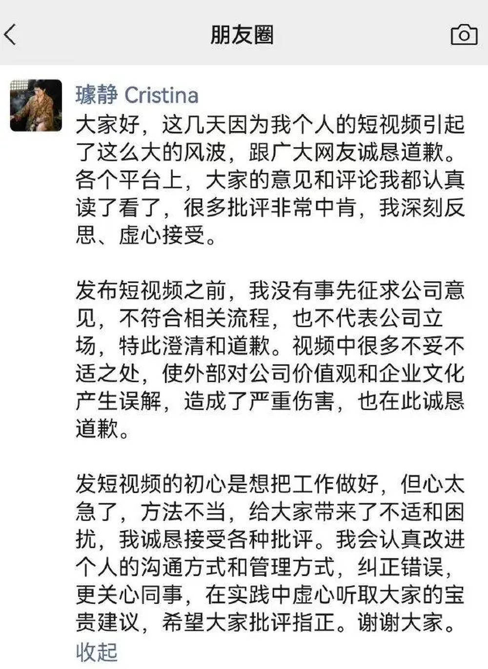 璩静表示,在发布短视频之前,她没有事先征求公司意见,不符合相关流程,也不代表公司立场,特此澄清和道歉。视频中很多不妥不适之处,使外部对公司价值观和企业文化产生误解,造成了严重伤害,也诚恳道歉。