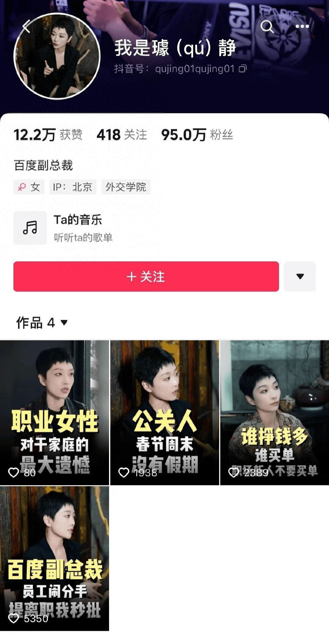 也正是在这样的要求下,百度公关近日也开始进行个人短视频号的内容输出。随着璩静的言论出圈,一位百度集团媒体中心负责人近日开设的视频号也被扒出。